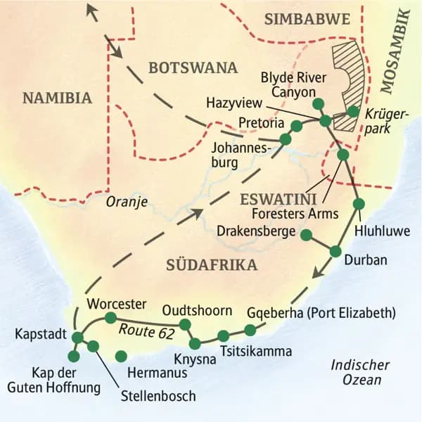 - Eine ausführliche, dreiwöchige Rundreise, die Ihnen Südafrika in allen Facetten nahebringt