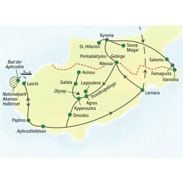 - Wichtigste Höhepunkte dieser Wanderreise durch Zypern: Kyrenia, Salamis, Famagusta, St. Hilarion, Nikosia, Pentadaktylos-Gebirge, Troodosgebirge, Paphos und Akamas-Halbinsel