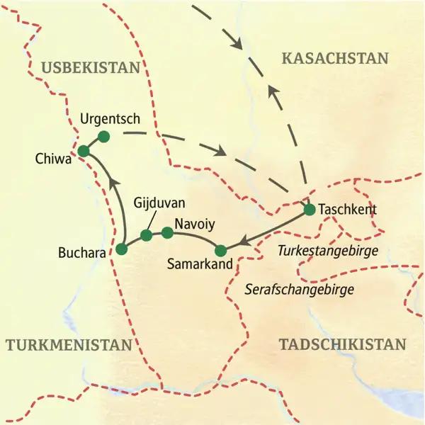 Verlauf der elftägigen Studienreise Usbekistan - Höhepunkte: Taschkent, Samarkand, Buchara, Chiwa, Taschkent.