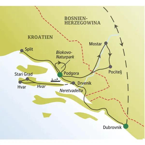 - 7 Übernachtungen im halben Doppelzimmer (Einzelzimmer gegen Aufpreis buchbar), Hotels mit Klimaanlage, in Podgora auch mit Swimmingpool