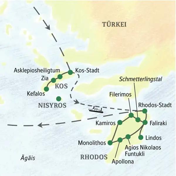 - Wichtigste Stationen dieser Studienreise: die Inselhauptstädte Kos- und Rhodos-Stadt sowie das Asklepiosheiligtum auf Kos und Lindos, Filerimos, Kamiros und Monolithos auf Rhodos