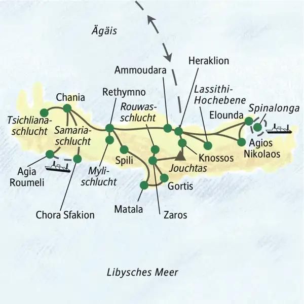 - Stationen dieser Wanderreise auf Kreta: Samariaschlucht, die Lassithi-Hochebene, Heraklion, Chania, Rethymno und Knossos