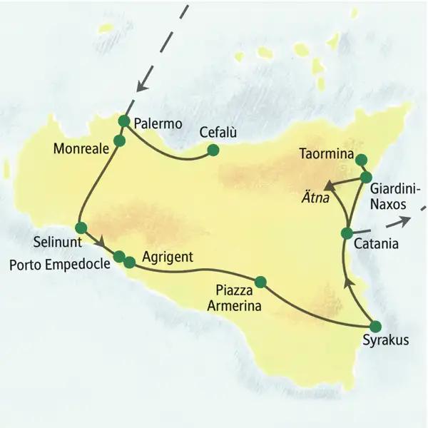 • Stationen dieser Studiosus-Reise nach Sizilien: Palermo, Monreale, Segesta, Selinunt, Agrigent, Villa Casale, Syrakus, Taormina und der Ätna