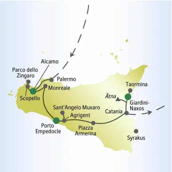 - Highlights dieser Rundreise: Palermo, Monreale, Trapani, Agrigent, Villa Casale, Taormina, der Ätna und auf Wunsch ein Ausflug nach Syrakus