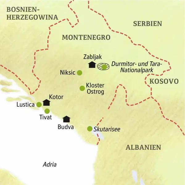Für die ersten drei Nächte in Kotor lädt mitten in der Altstadt das Historic Boutique Hotel Cattaro – das frühere Napoleonische Stadttheater – mit 20 stilvollen Zimmern, Bar und Terrasse zum Genießen und Entspannen ein. Umgeben von der grandiosen Landschaft des Durmitor-Nationalparks empfängt uns dann für zwei Nächte bei Zabljak das rustikale Hotel Polar Star mit 22 Zimmern, Restaurant und Waldsauna. In zentraler Lage, nur ein paar Schritte vom Strand und der Uferpromende entfernt, in Budva erwartet uns dann für die letzten zwei Nächte das Hotel Bracera mit 51 Zimmern mit Balkon und Meerblick, sowie einem Wellnessbereich mit kleinem Innenpool.