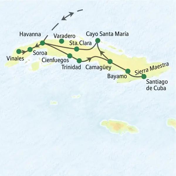 - Wichtigste Stationen dieser Studiosus-Reise durch Kuba: Havanna, Vinales, Trinidad, Santiago de Cuba, Cayo Santa María
