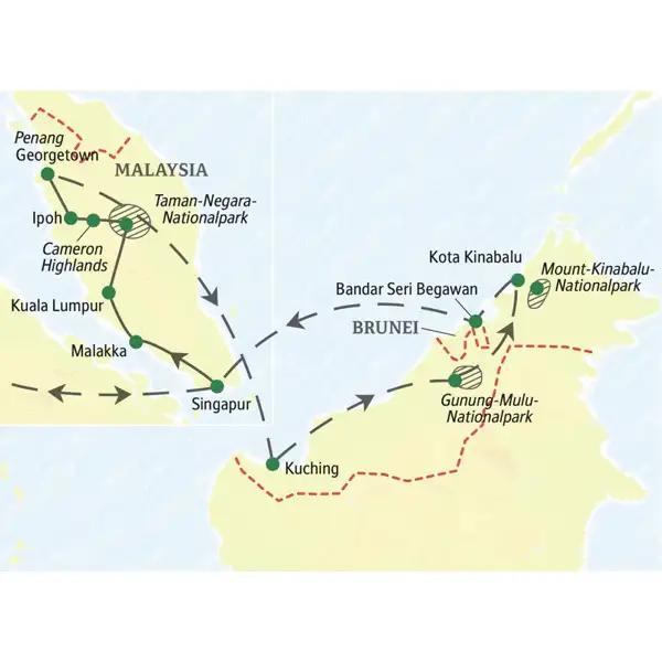 - Wichtigste Stationen dieser Studiosus-Reise durch Malaysia: Malakka, Kuala Lumpur, Penang, Taman-Negara-Nationalpark, Kuching, Gunung-Mulu-Nationalpark, dazu die Metropole Singapur. Auf Wunsch Ausflug in den Kinabalu-Nationalpark (UNESCO-Welterbe)