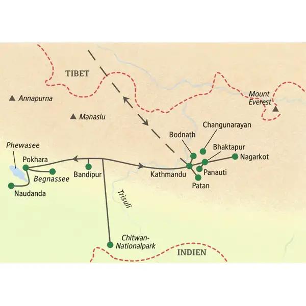 Die Karte zeigt den Verlauf unserer Studienreise Nepal - am Thron der Götter: Kathmandu, Chitwan-Nationalpark, Pokhara, Begnassee, Naudanda, Bandipur, Patan, Bodnath, Bhaktapur, Nagarkot, Panauti