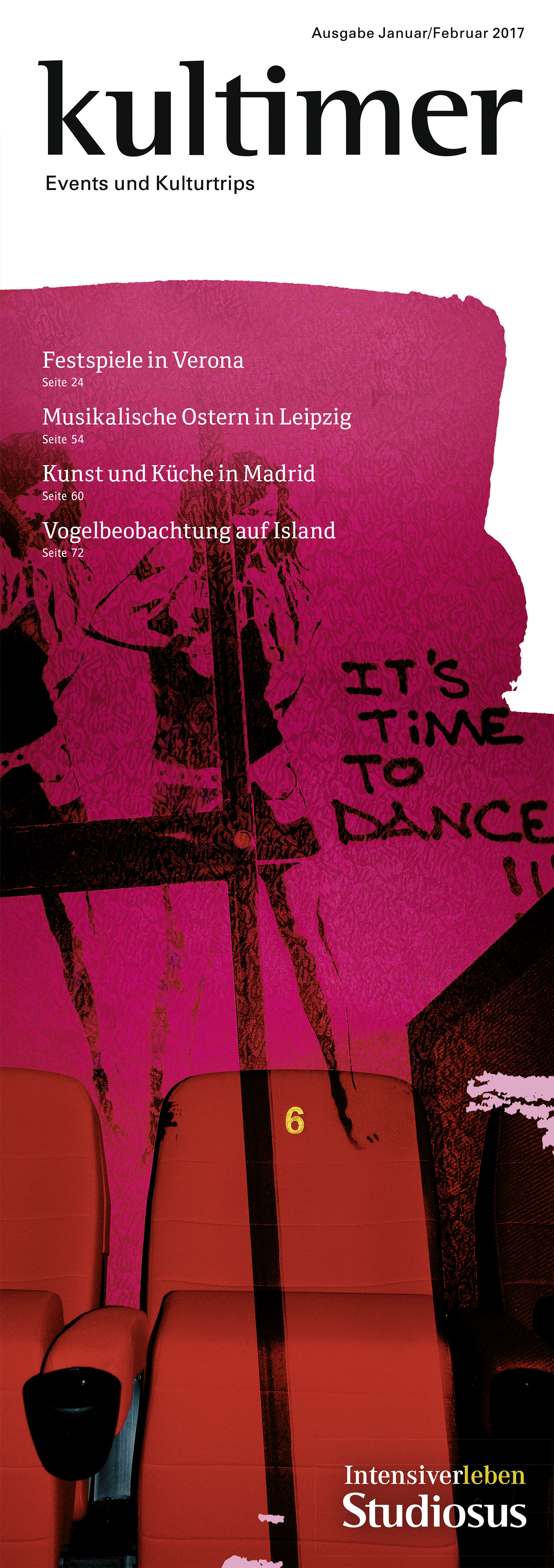 Kurz, konzentriert, kulturorientiert: Der kultimer-Katalog von Studiosus erscheint sechsmal im Jahr mit jeweils mehr als 40 Kulturtrips weltweit. Er bietet Kurzreisen zu herausragenden Events mit einem Rahmenprogramm, das von einem speziell qualifizierten Studiosus-Reiseleiter begleitet wird. Das kultimer-Angebot ist eine Mischung aus Kurztrips zu Konzerten, Ausstellungen und Theateraufführungen in aller Welt. Zur Wahl stehen aber auch zahlreiche Reisespecials zu den Themen Flora, Fauna und Kulinarik. Charakteristisch für alle kultimer-Reisen ist das Rundum-Sorglos-Leistungspaket: Die perfekte Organisation inklusive Eintrittskarten, Rahmenprogramm und Studiosus-Reiseleitung. Ein weiteres Plus: Viele kultimer-Angebote sind auch als individuelles Paket aus Hotel, Event und Anreise buchbar. Internet: www.kultimer.com