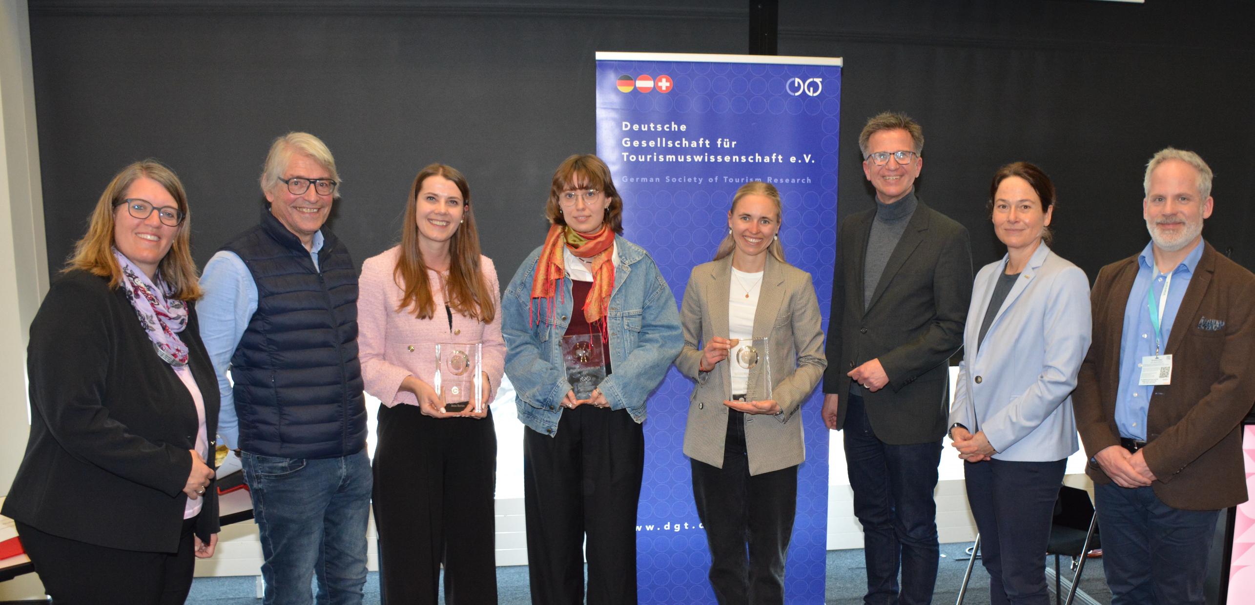 DGT-Vorstandsmitglied Prof. Dr. Monika Bandi, DGT-Präsident Univ.-Prof. Dr. Jürgen Schmude, die Preisträgerinnen Anna Burton, Louisa Wewetzer und Gloria Bukal, der Leiter Öffentlichkeitsarbeit der Studiosus-Gruppe Dr. Frano Ilic sowie die beiden DGT-Vorstandsmitglieder Prof. Dr. Kerstin Heuwinkel und Prof. Dr. Markus Pillmayer (v.l. nach r.) auf der Verleihung des DGT-ITB-Wissenschaftspreises. Quelle: Andreas Taschler