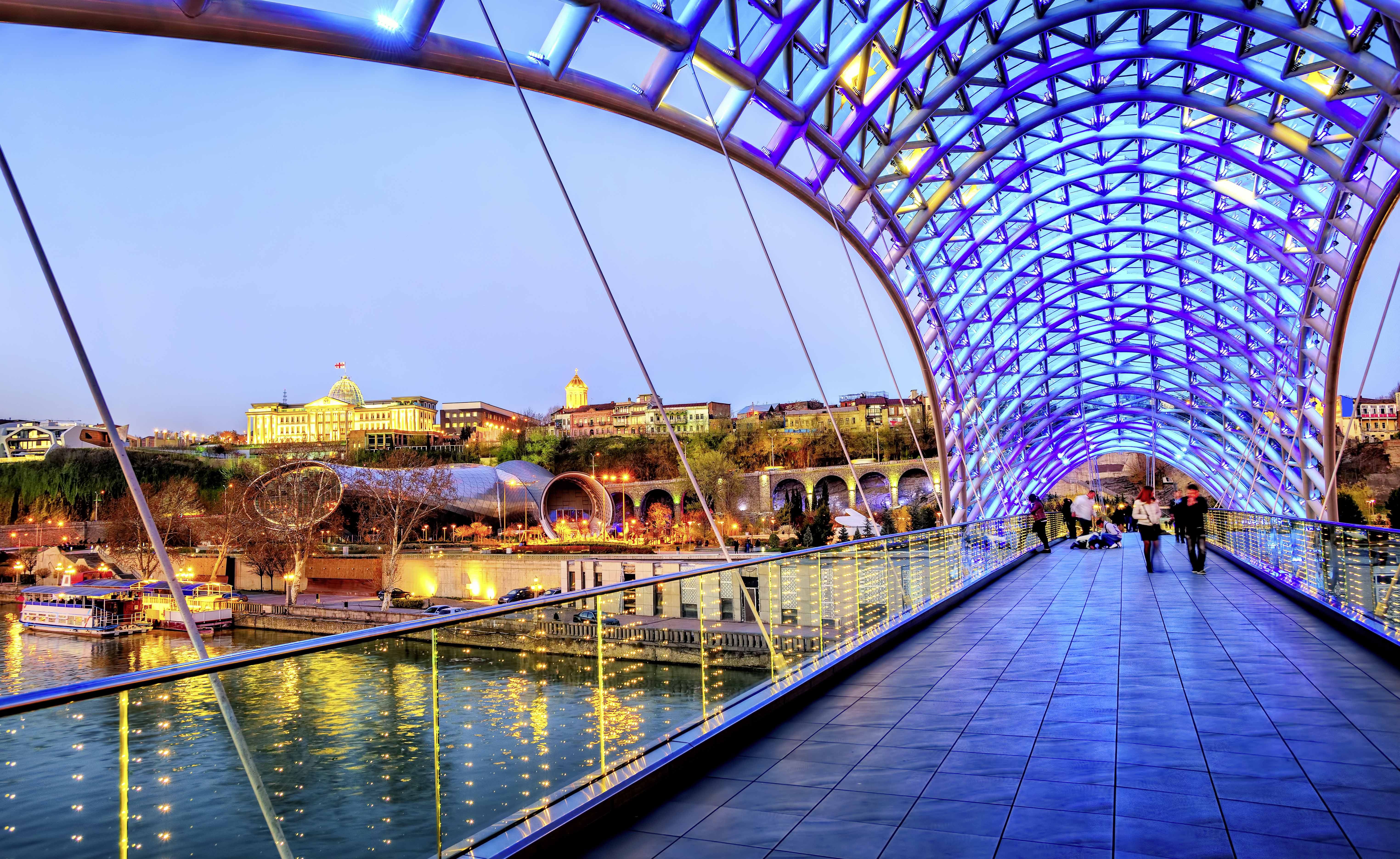 Von der Friedensbrücke in Tiflis blicken Besucher auf den Architekturmix der Stadt. Quelle: Boris Stroujko/Shutterstock.com