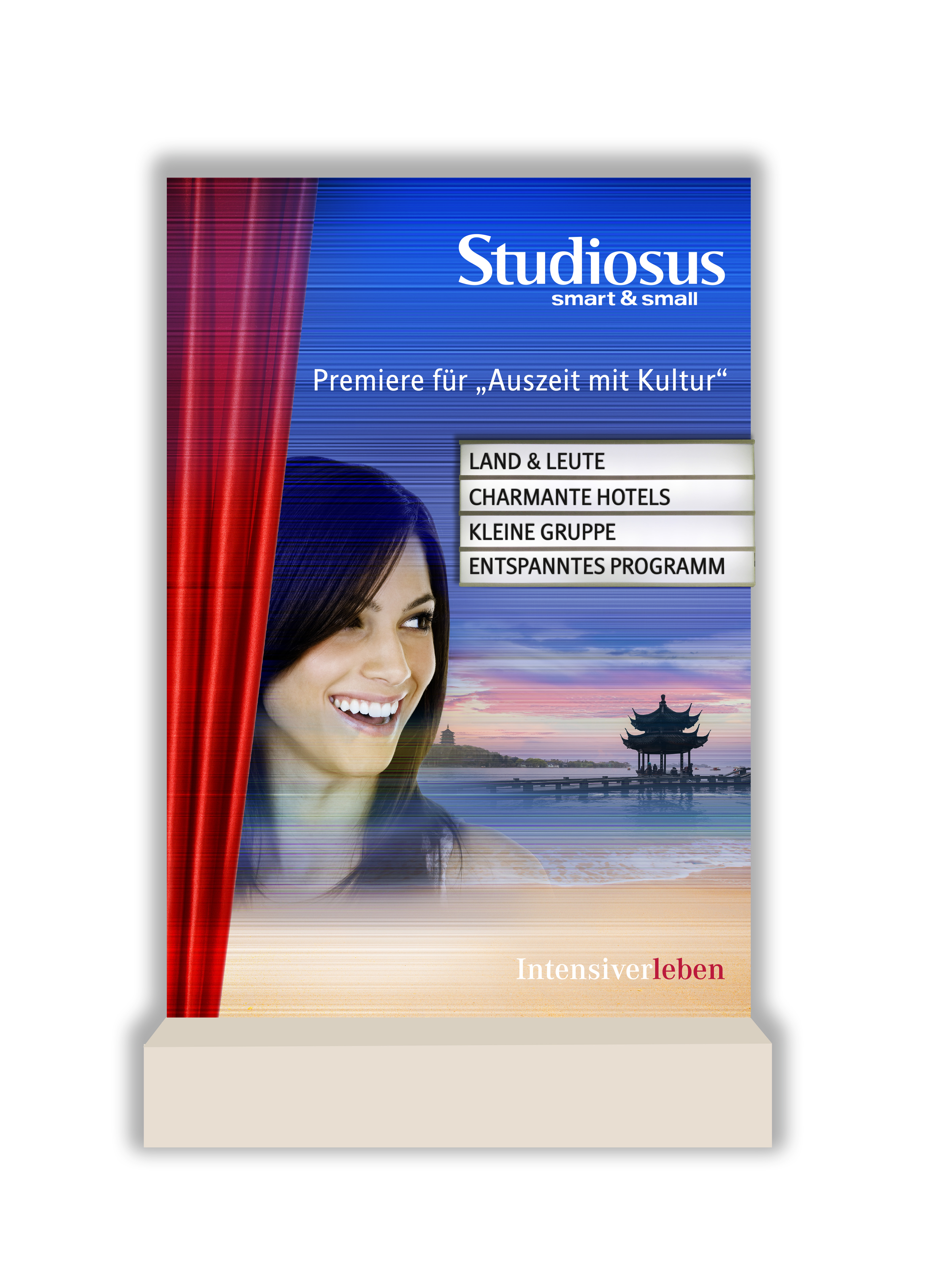 In die neuen Aufsteller von Studiosus smart & small ist nämlich eine Lichtbox integriert - im Stile klassischer Kino-Programmanzeigen mit großen Lettern vor leuchtendem Hintergrund.
