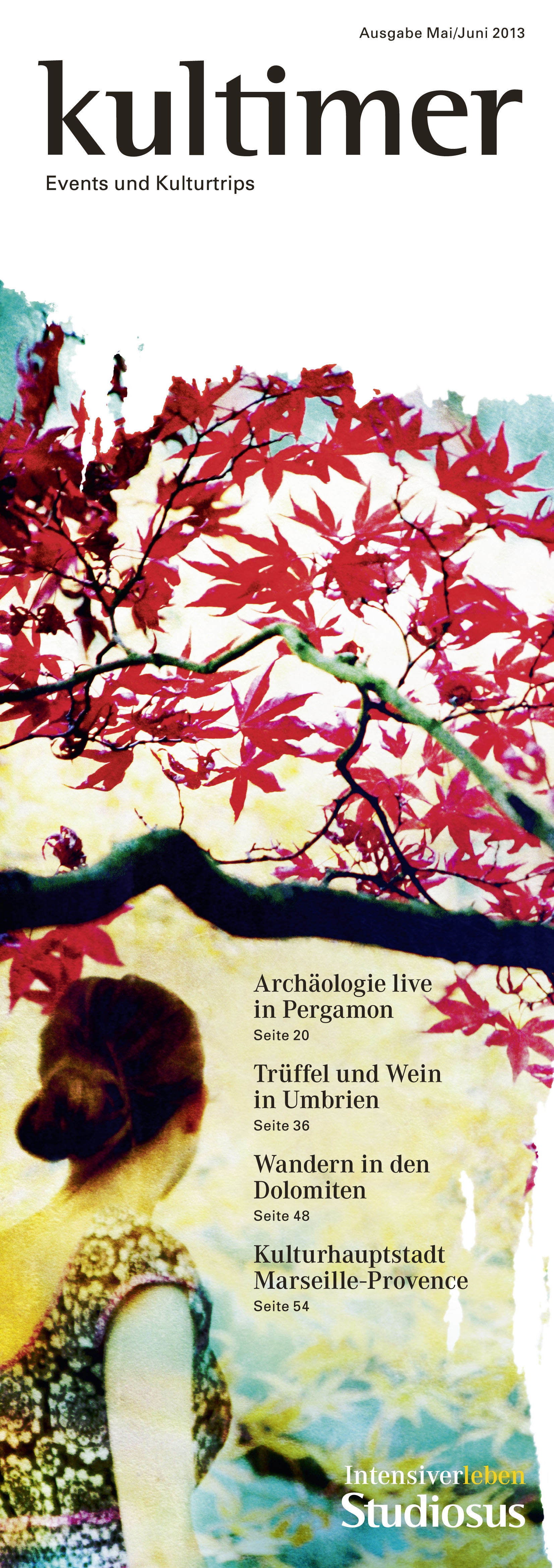 Kurz, konzentriert, kulturorientiert: Der Eventreisen-Katalog kultimer von Studiosus erscheint sechs Mal jährlich und bündelt jeweils mehr als 40 Events und Kulturtrips weltweit. Die ausgewählten Ereignisse und Veranstaltungen werden um ein dazu passendes Rahmenprogramm ergänzt, durch das ein Studiosus-Reiseleiter führt. Aber auch ein individuelles Paket aus Hotel, Event und auf Wunsch auch Anreise ist bei vielen Angeboten buchbar. Internet: www.kultimer.com und www.studiosus.com