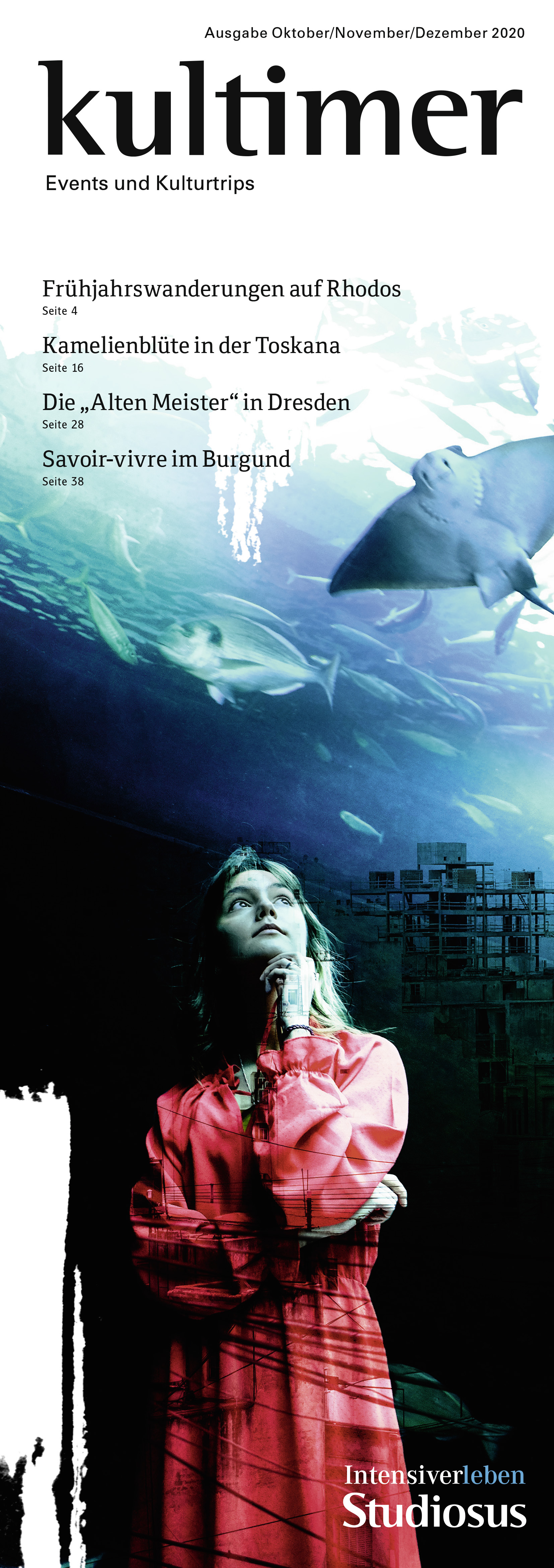 Kurz, konzentriert, kulturorientiert: Der kultimer-Katalog von Studiosus bietet Kurzreisen zu herausragenden Events mit einem Rahmenprogramm, das von einem speziell qualifizierten Studiosus-Reiseleiter begleitet wird. Das kultimer-Angebot ist eine Mischung aus Kurztrips zu Konzerten, Ausstellungen und Theateraufführungen in aller Welt. Zur Wahl stehen aber auch zahlreiche Reisespecials zu den Themen Flora, Fauna und Kulinarik. Charakteristisch für alle kultimer-Reisen ist das Rundum-Sorglos-Leistungspaket: Die perfekte Organisation inklusive Eintrittskarten, Rahmenprogramm und Studiosus-Reiseleitung. Ein weiteres Plus: Viele kultimer-Angebote sind auch als individuelles Paket aus Hotel, Event und Anreise buchbar. Internet: www.kultimer.com