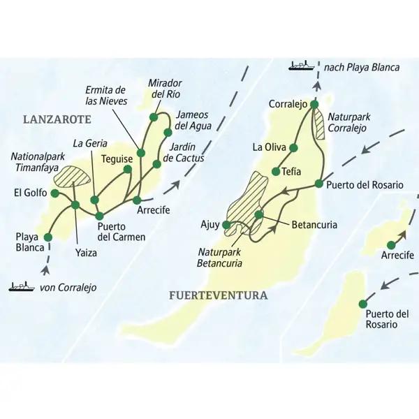 - Wichtigste Stationen dieser Studiosus-Reise auf Fuerteventura und Lanzarote: Corralejo, Betancuria, Puerto del Carmen, Teguise und Timanfaya