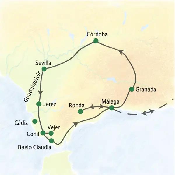 Unsere 15-tägige Studienreise mit Muße durch Andalusien führt uns von Málaga aus in die Städte Granada, Córdoba, Sevilla, Jerez, Conil sowie Ronda.
