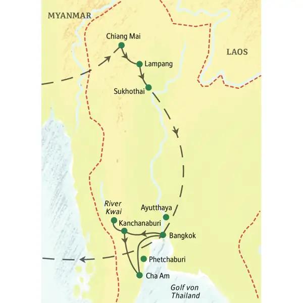 Wichtigste Stationen unserer Studienreise mit Muße nach Thailand: Chiang Mai, Bangkok, River Kwai, Sukhothai, Cha Am