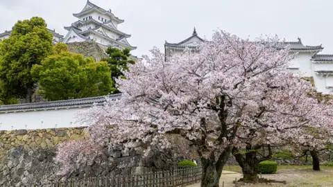 Eine Person in traditioneller japanischer Kleidung vor Kirschblüten.