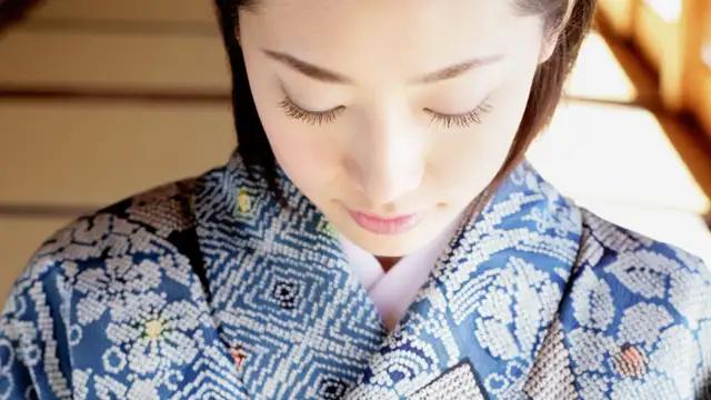 Eine Frau in einem Kimono, die an einer japanischen Teezeremonie teilnimmt.