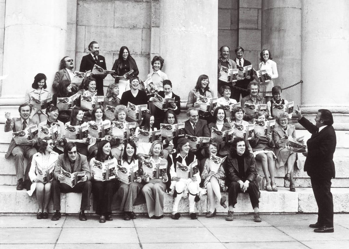 20 Jahre Studiosus: Firmengründer Werner Kubsch bittet seine Mitarbeiterinnen und Mitarbeiter 1974 zum Gruppenfoto.