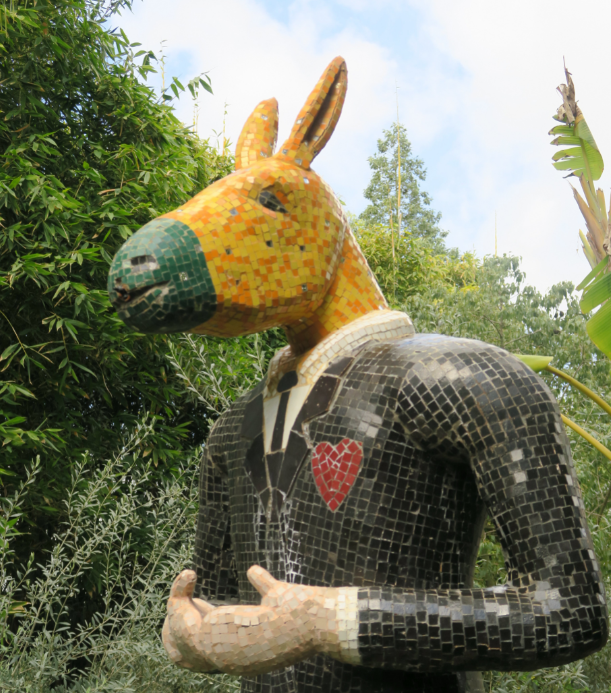 Inmitten der üppigen Botanik tauchen immer wieder bunte, teils überdimensionale Kunstwerke auf. Ein Esel in Krawatte und Anzug zum Beispiel, aus Tausenden Mosaikteilchen zusammengesetzt. Über seine Vorderhufe sind Boxhandschuhe gestülpt – als ob er sich gegen all die Arbeit wehren will, die man ihm weltweit aufbürdet. Etwa die Hälfte der Skulpturen stammt von Heller, der Rest von teils unbekannten, teils renommierten Künstlern wie Keith Haring. „Die Kunstwerke sind sehr unterschiedliche, sehr spannende Antworten kreativer Meister auf das Thema Natur und Garten als Flanierzone“, sagt Heller.