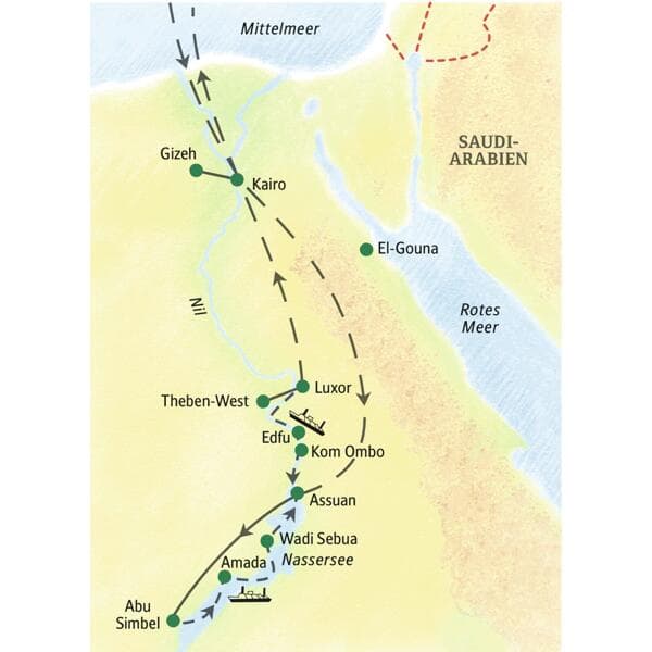 - Linienflug mit Egypt Air (Economy, Tarifklasse G) von Frankfurt nach Assuan und zurück von Kairo, nach Verfügbarkeit