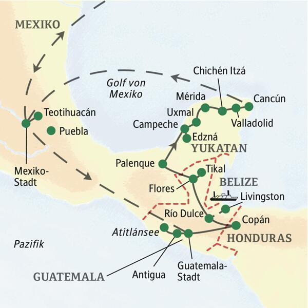 - Wichtigste Stationen dieser Studiosus-Reise durch Mittelamerika: Mexiko-Stadt, Puebla, Antigua, Atitlánsee, Tikal, Copán, Palenque und Chichén Itzá