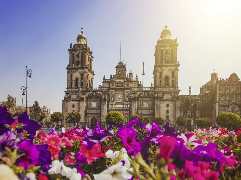 Bahnanreise 1. Klasse zum Flughafen. Im Laufe des Tages Flug nach Mexiko-Stadt. Ankunft am Abend und Transfer ins Hotel. Vier Übernachtungen im historischen Zentrum von Mexiko-Stadt (2250 m).
