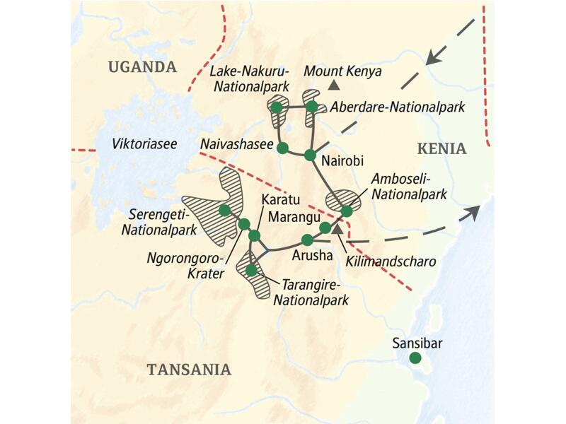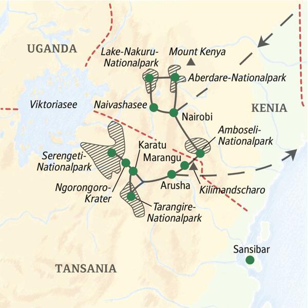 Alle touristisch erschlossenen Regionen und Nationalparks in Kenia und Tansania gelten derzeit als weitgehend sicher. Wie in anderen Ländern auch sollten Sie sich von politischen und religiösen Versammlungen fernhalten. Wegen der erhöhten Gefahr terroristischer Anschläge verzichten wir auf Aufenthalte und Besichtigungen im Stadtzentrum von Nairobi.