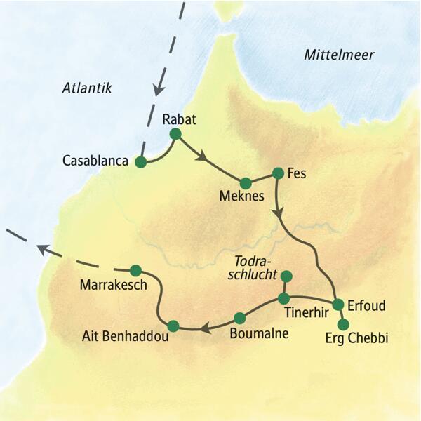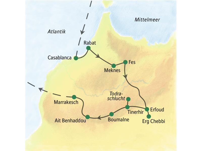 - Alle vier Königsstädte, den Mittleren und Hohen Atlas und die unvergleichliche Stille der Wüste in zehn Tagen erleben