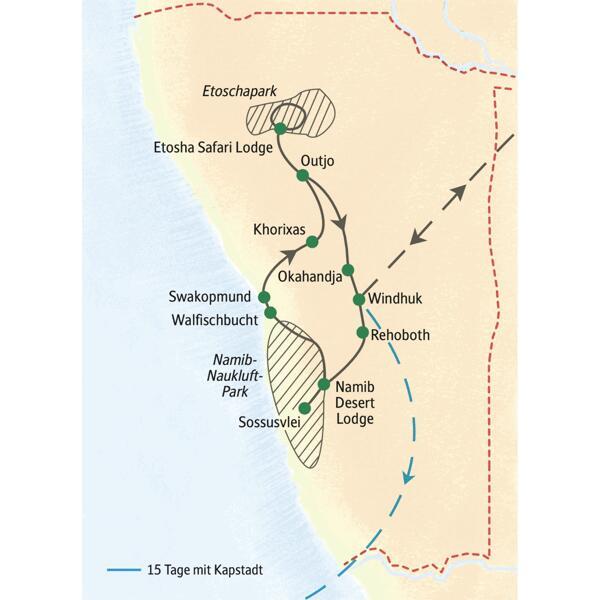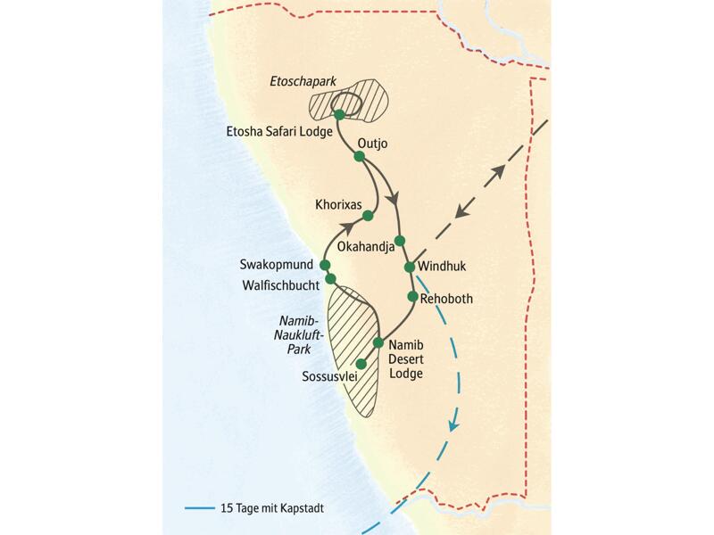 - 12 Übernachtungen im Doppelzimmer, Hotels und Lodges mit Klimaanlage und Swimmingpool (außer in Swakopmund)