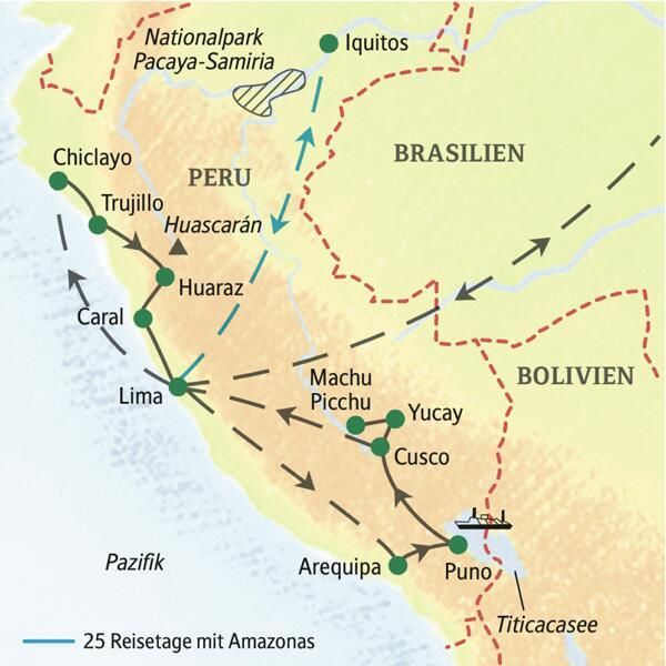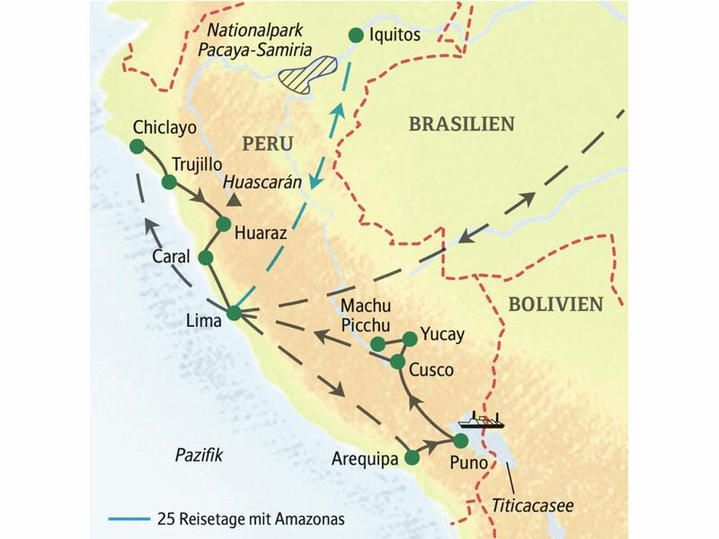 - Wichtigste Stationen dieser Rundreise durch Peru: Lima, Trujillo, Chiclayo, Titicacasee, Cusco, Machu Picchu und Amazonas