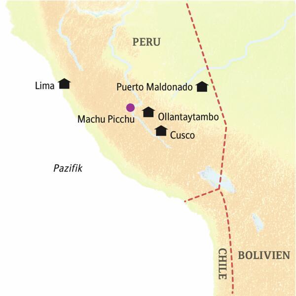 Costa, die Küste mit der Metropole Lima inmitten der Wüste - Sierra, die Gipfel der Anden und Heimat der Inkas - Selva, der geheimnisvolle Regenwald des Amazonas-Tieflands: Starke Gegensätze prägen Peru und machen den faszinierenden Spannungsbogen dieser Reise aus. Erleben Sie die Vielfalt des Landes in kleiner Gruppe besonders intensiv, sprechen Sie mit Einheimischen, genießen Sie die weltberühmte Küche, entdecken Sie Machu Picchu und Cusco. Ausgangsbasis: charmante Hotels in Lima, Cusco und im Heiligen Tal sowie eine Lodge im Regenwald.