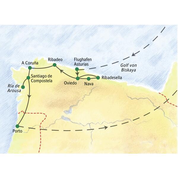 - Wichtigste Stationen dieser Studiosus-Reise durch Nordspanien: Oviedo, Ribadeo, A Coruna und Santiago de Compostela