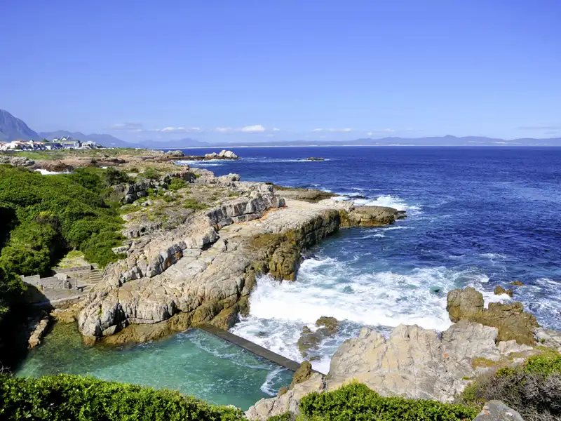 In Hermanus wohnen wir in der • Auberge Burgundy: 19 Zimmer mit Komfort, eine Sonnenterrasse mit Pool, freundliche Gastgeber und die gelöste Atmosphäre eines südafrikanischen Ferienortes erwarten Sie. Abends tafeln wir gemeinsam in einem nahe gelegenen Restaurant. Das Frühstück nehmen Sie in einem kleinen Café nebenan ein. Am Abend sitzt man schön im schattigen Innenhof.